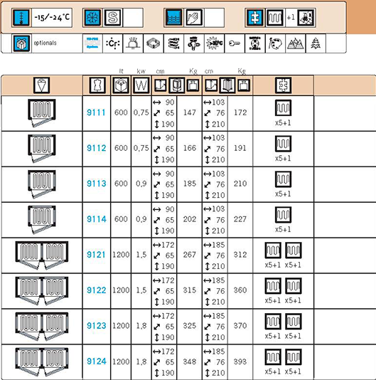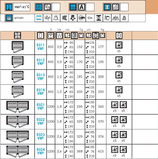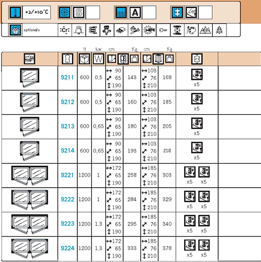 Βιτρίνες στατικής ή βεβιασμένης ψύξης Ιταλικής προέλευσης, εξαιρετικής ποιότητας, σύμφωνα με τις προβλεπόμενες από την Ε.Ε. προδιαγραφές ποιότητας, ασφάλειας και υγιεινής, με μόνο στην πόρτα ή και στις 4 πλευρές κρύσταλλα.