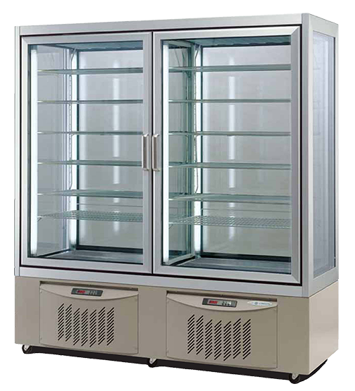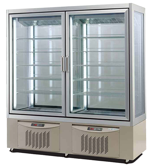 Βιτρίνες στατικής ή βεβιασμένης ψύξης Ιταλικής προέλευσης, εξαιρετικής ποιότητας, σύμφωνα με τις προβλεπόμενες από την Ε.Ε. προδιαγραφές ποιότητας, ασφάλειας και υγιεινής, με μόνο στην πόρτα ή και στις 4 πλευρές κρύσταλλα.